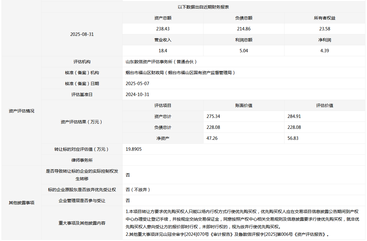 • 轉(zhuǎn)讓方: 煙臺(tái)市福山區(qū)財(cái)政局(煙臺(tái)市福山區(qū)國(guó)有資產(chǎn)監(jiān)督管理局)